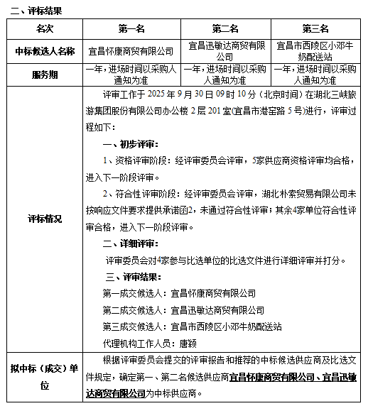 宜昌桃花岭生态农业有限公司于2025年9月19日在湖北三峡文化旅游集团有限公司招标采购平台发布比选公告,2025年9月30日09时00分在湖北三峡旅游集团股份有限公司办公楼2层201室(宜昌市港窑路5号)比选,采购人根据评审委员会提交的评审报告,现将中标候选人及中标结果公示如下: